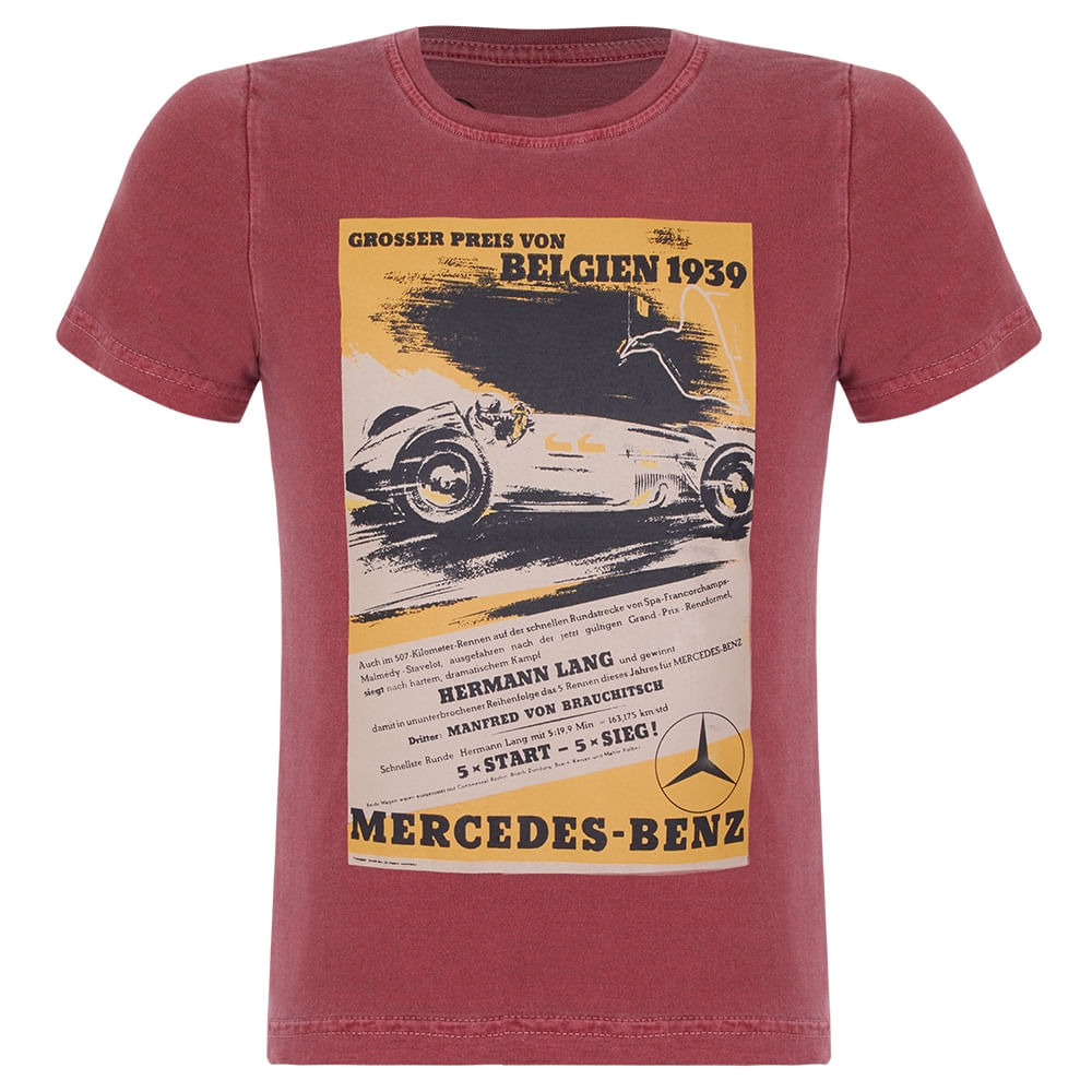 A Camiseta Infantil Mercedes-Benz apresenta para os pequenos fãs de automobilismo o Grande Prêmio da Bélgica de 1939. Produzida em tecido com lavagem especial estonada, esta camiseta em 100% Algodão exibe a estampa com a ilustração do modelo W165, o carro que disputou e ganhou a corrida pela Mercedes-Benz naquele ano. Camiseta cheia de estilo e conforto para os pequenos usarem em diversos momentos.