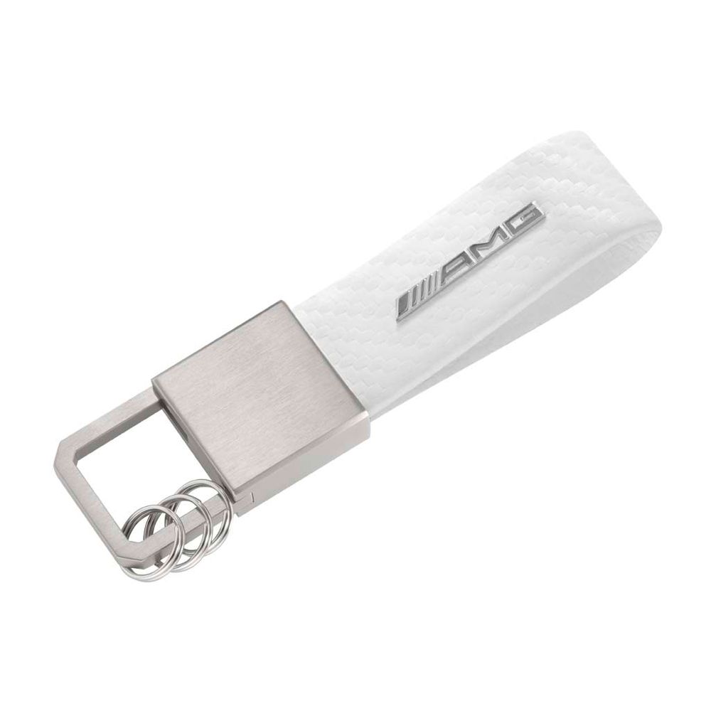 Este chaveiro esportivo e elegante é feito de couro branco com um aspecto de fibra de carbono de alta qualidade. Material aço inoxidável escovado e um elegante mecanismo de tração / torção proporcionam um contraste atraente.